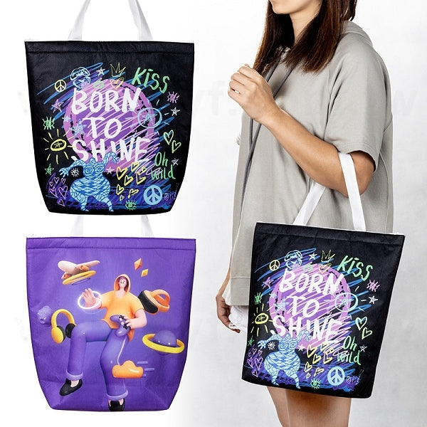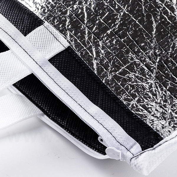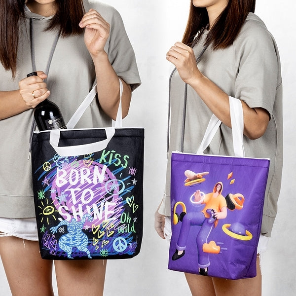 不織布袋單片式3面款式(梯形袋),內裡2mm厚保溫鋁膜,開口拉鍊。全彩滿版印刷在袋身兩面與底部,好設計,廣告效益大。