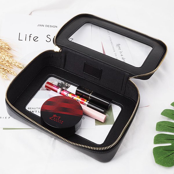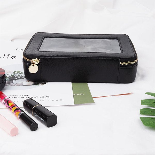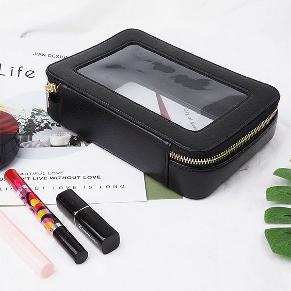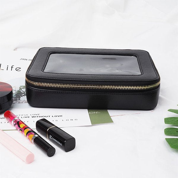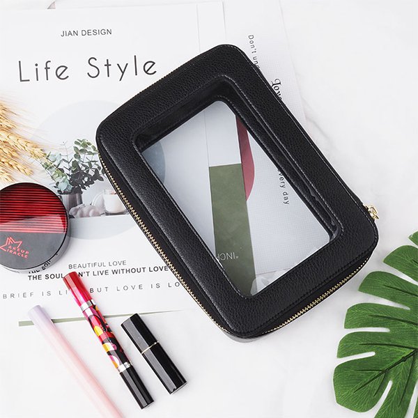質感透明拉鍊盥洗包-PVC+PU皮革化妝包