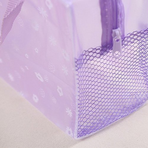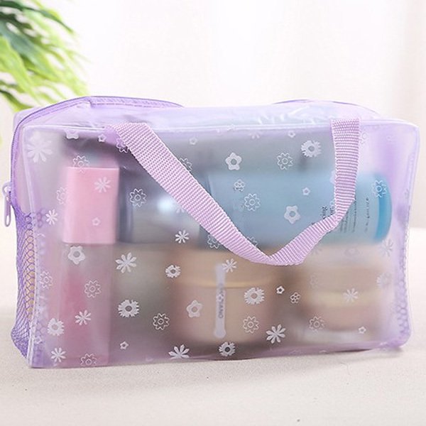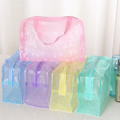 1. 粉嫩PVC旅行提袋,尺寸為24.5X17X9公分,適合放置化妝品、文具等小物件,方便收納。