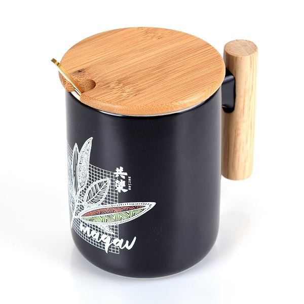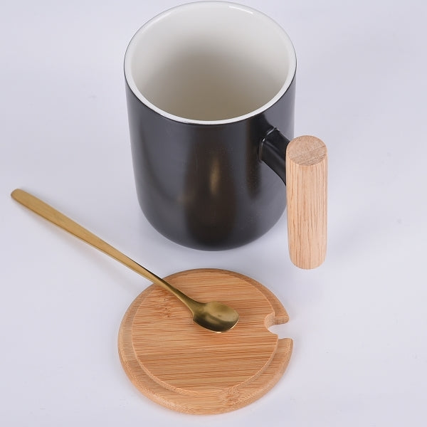 350ml竹蓋木把手陶瓷馬克杯-附湯匙