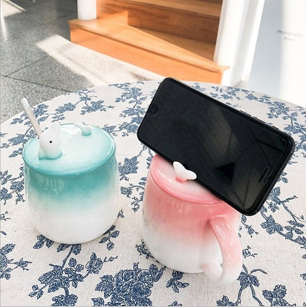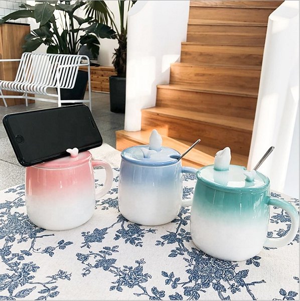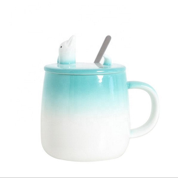 400ml海豚漸層陶瓷馬克杯-附蓋子湯匙-附手機支架
