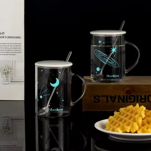 500ml創意星月夜光玻璃杯-咖啡奶茶杯-透明附蓋玻璃杯