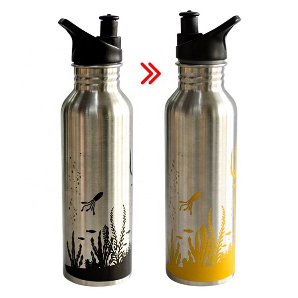1. 不銹鋼材質,500ml容量,7.2*22cm尺寸,適用於家裡、公司、旅行等場合使用。特色是倒入低於17攝氏度的冷水後,杯身上的圖案會產生變化,吸嘴設計方便喝取,附提把方便攜帶。