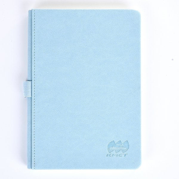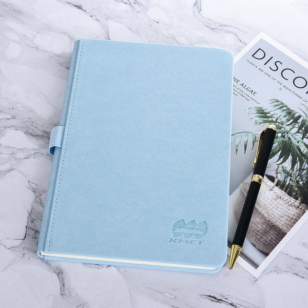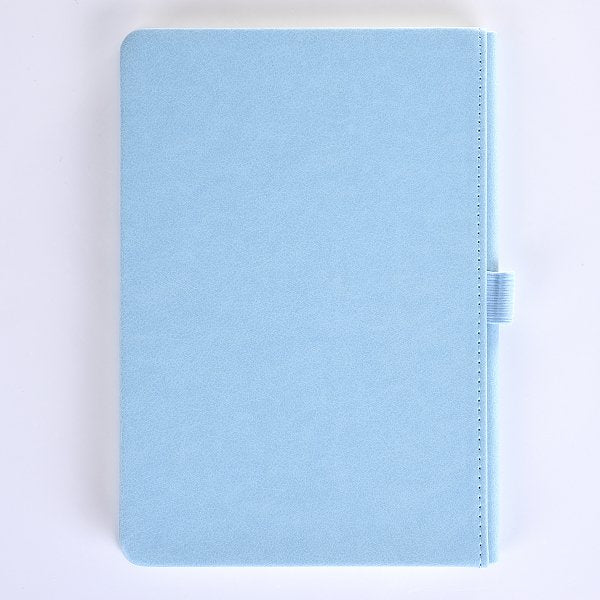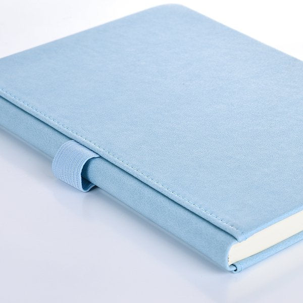 3. 25K時尚典雅工商日誌,專為企業客製化設計。PU皮封面天藍色變色,壓印LOGO,內頁可訂製印刷,配淺藍筆插鬆緊帶。展現企業品牌風格,提升形象。
