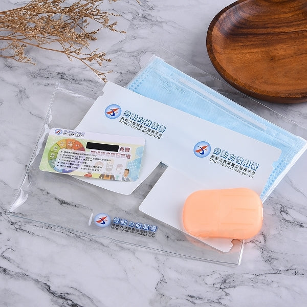 1. 防疫禮品組,包含透明夾鍊袋、口罩、口罩收納夾、香皂紙、額溫卡,讓生活更安心更健康。