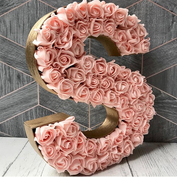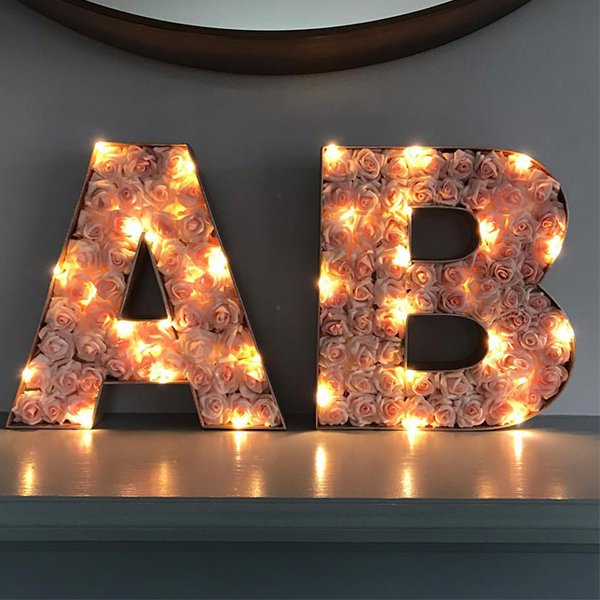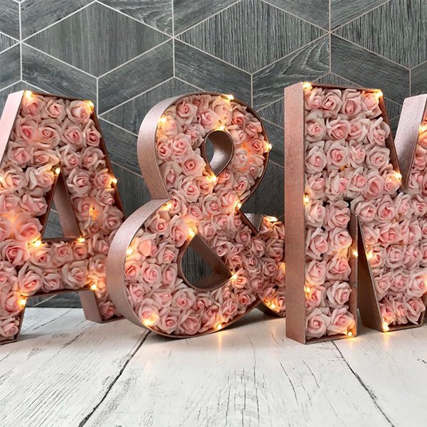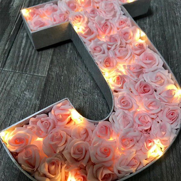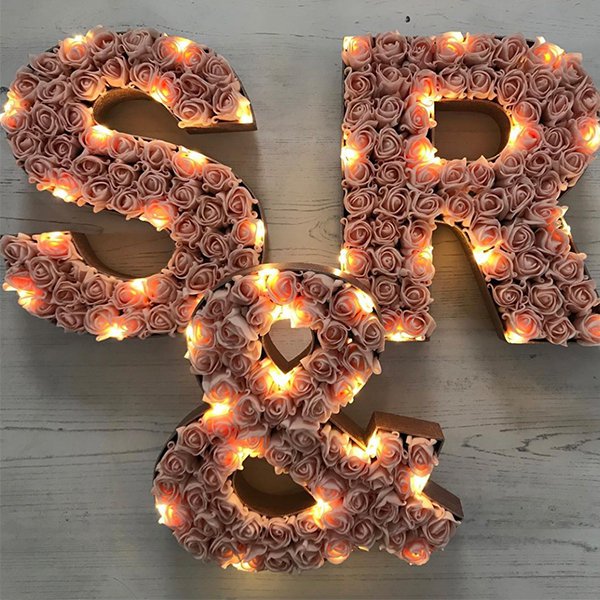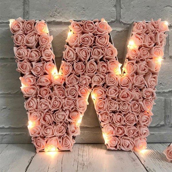 1. 粉色布玫瑰LED字母擺飾,適用於婚禮小物裝飾,營造浪漫氛圍。