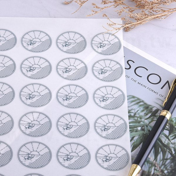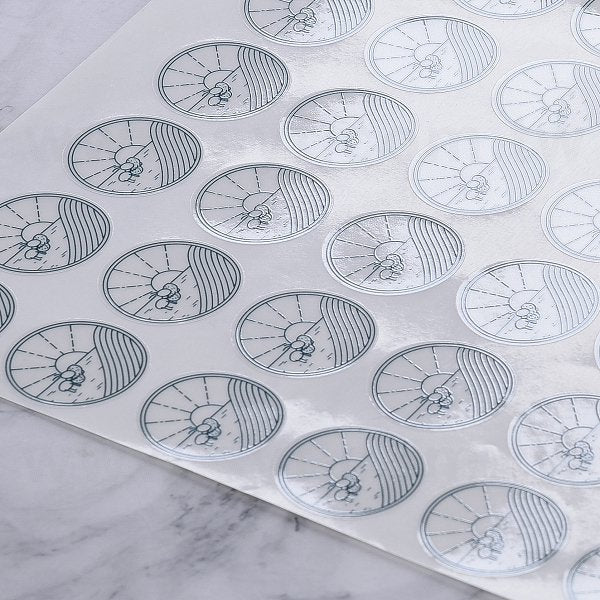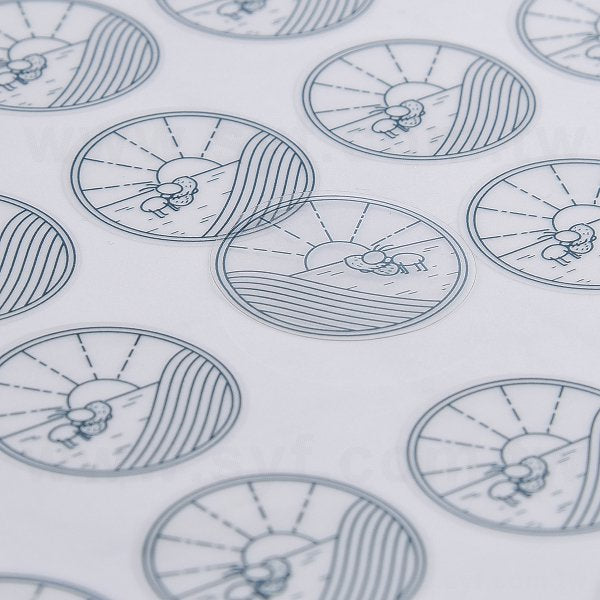 1. 圓形透明貼紙,材質為透明亮膜,色彩鮮豔,增添視覺吸引力。尺寸為30mm,適合用於公司產品包裝上,展現專業品質。