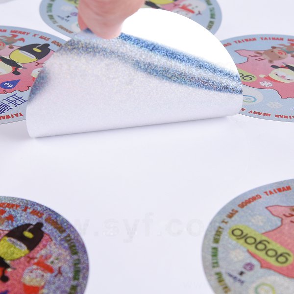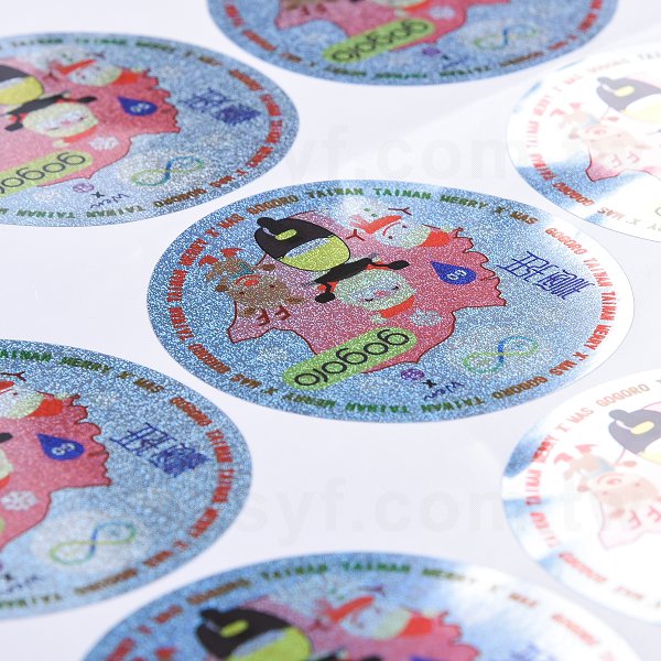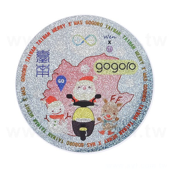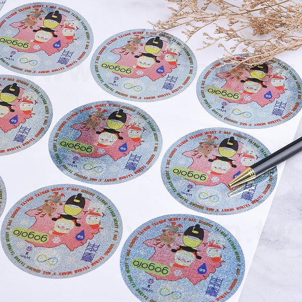 1. 圓形雷射貼紙,砂點雷射材質,白墨印刷,亮膜保護,尺寸80mm,適合企業禮贈品。