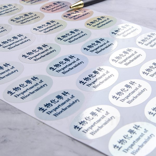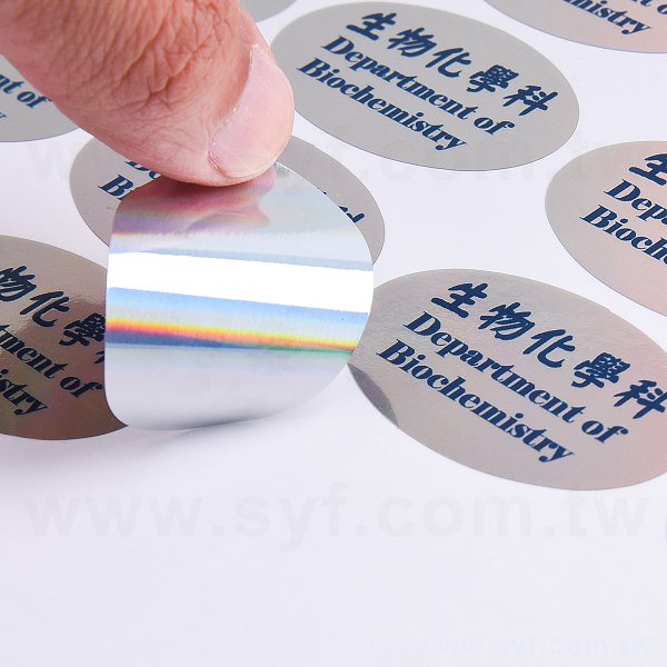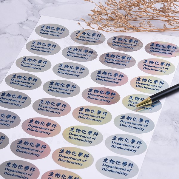 1. 橢圓形雷射貼紙,尺寸50x30mm,適合公司產品包裝,展現專業感。