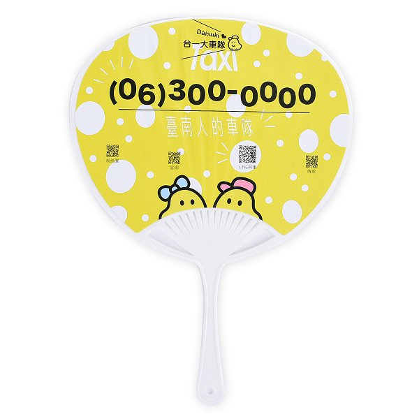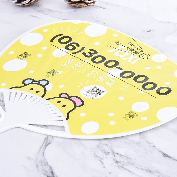 4. 尺寸為23.7x18.7cm,適中大小方便攜帶。橢圓形扇印刷設計獨特,可客製化印刷公司標誌或口號。