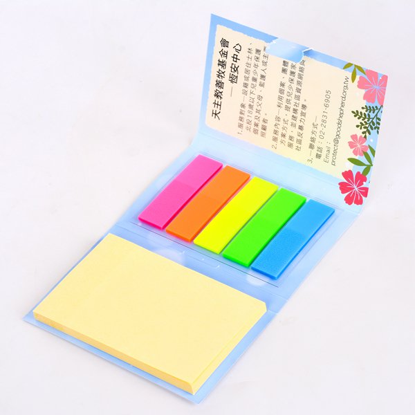 2. 長方型便利貼尺寸7.6x5cm,內含50張,五色平頭標每色30張。