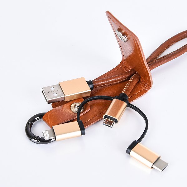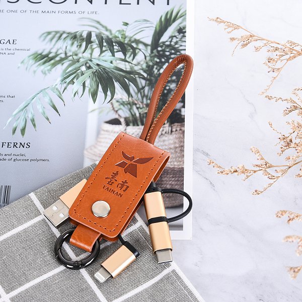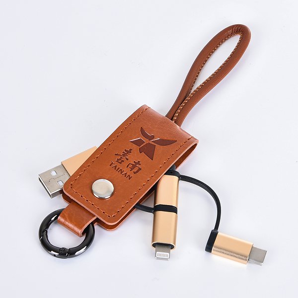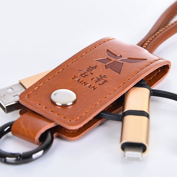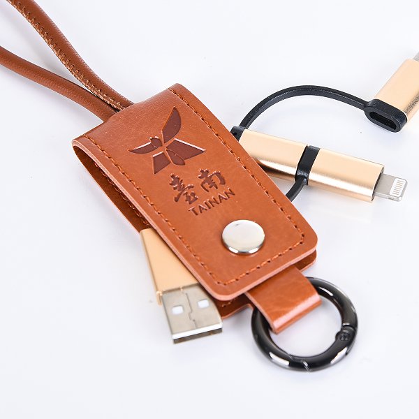 三合一皮革鑰匙圈-伸縮拉繩充電線