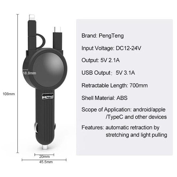 1. 尺寸小巧方便攜帶,適合在車上使用,支援TypeC和iPhone接口,還有一個USB端口,多設備同時充電。