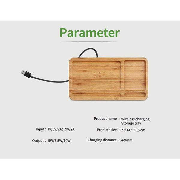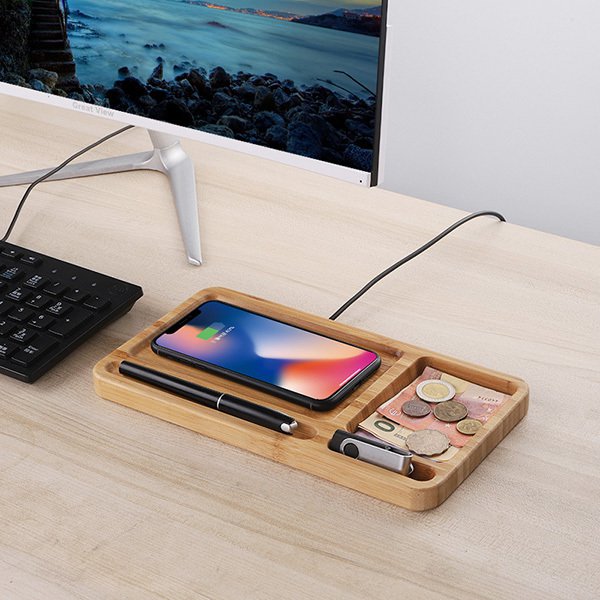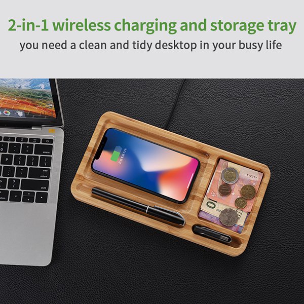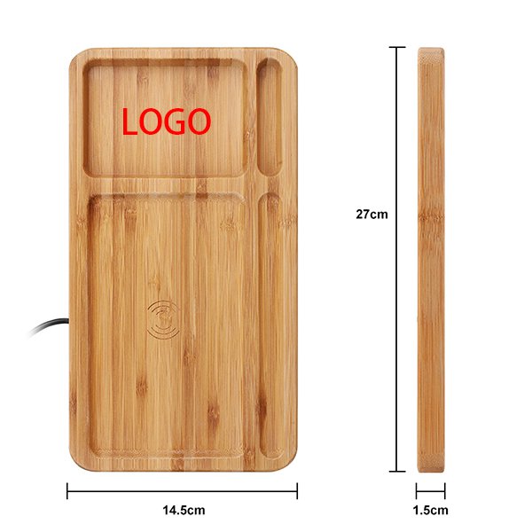 1. 木質置物盤兼具充電功能,尺寸為27*14.5*1.5cm,讓桌面整潔又方便。