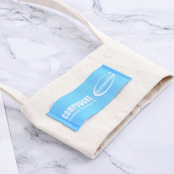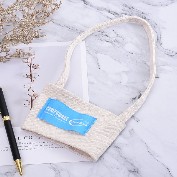 3. 環保杯袋,12安米色帆布杯套,工藝精湛,布標一色印刷,環保又具實用價值。