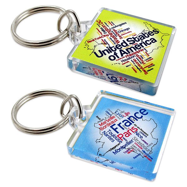 1. 壓克力鑰匙圈客製切型,雙面彩色印刷,展示獨特設計與企業形象。