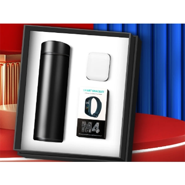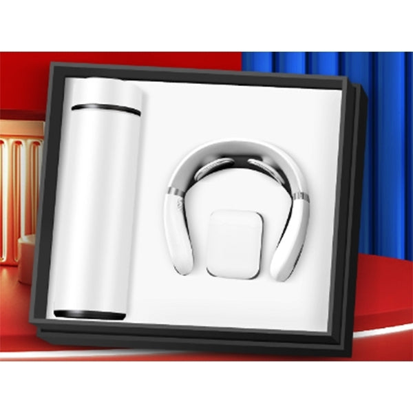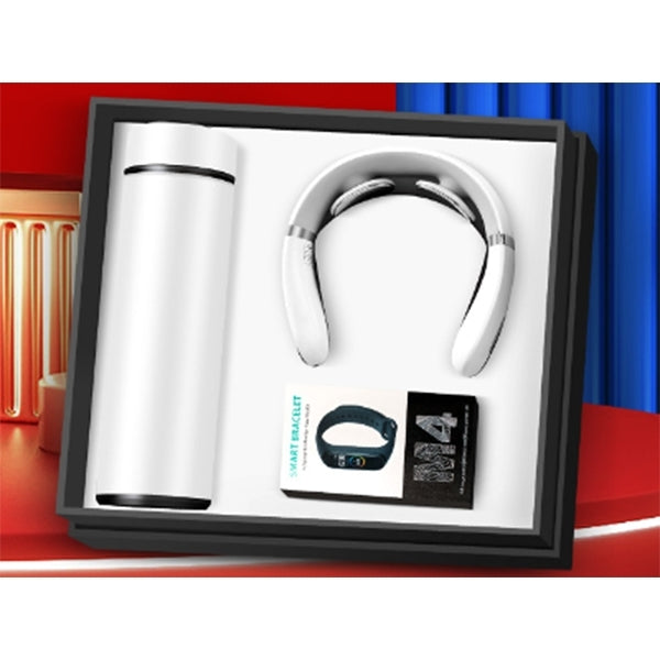 1. 商務禮盒內含保溫杯、藍芽耳機、頸椎按摩器、運動手環,滿足商務人士的日常需求。