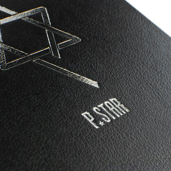 - 封面:亮面粗皮紋裱厚紙板 / 封面、封底各一處烙印+燙銀