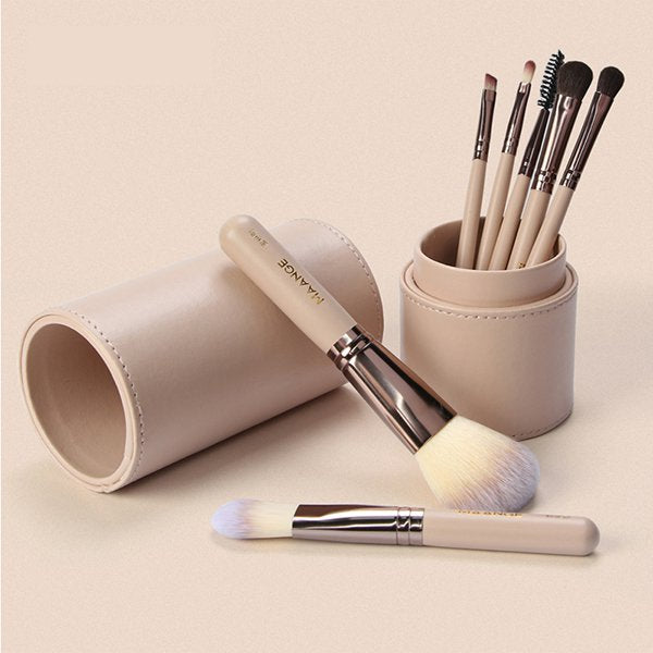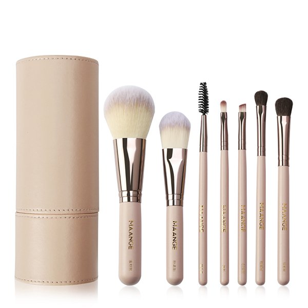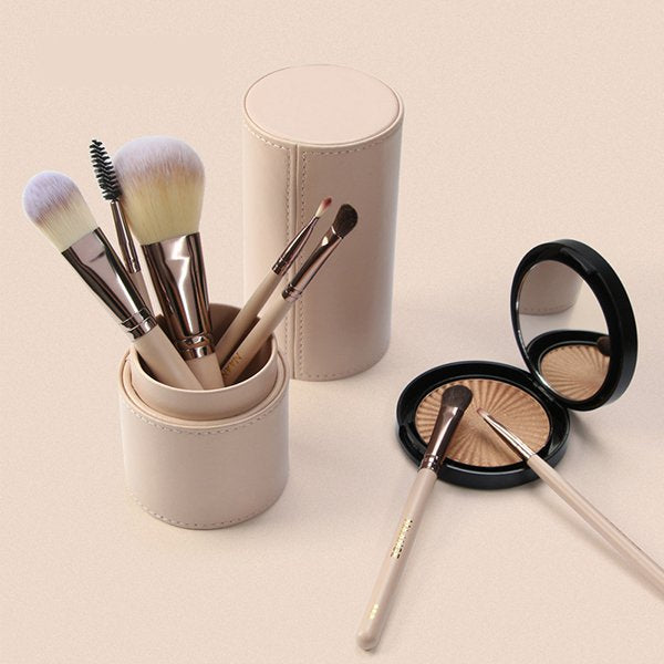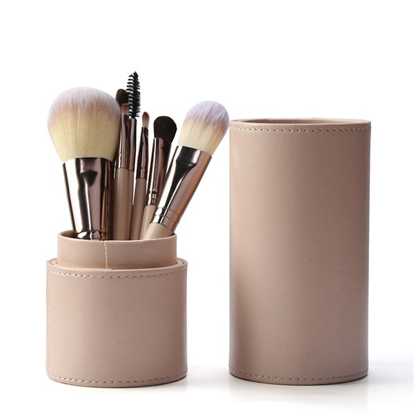 7件組彩妝刷具-皮革圓筒化妝包-塑料刷柄