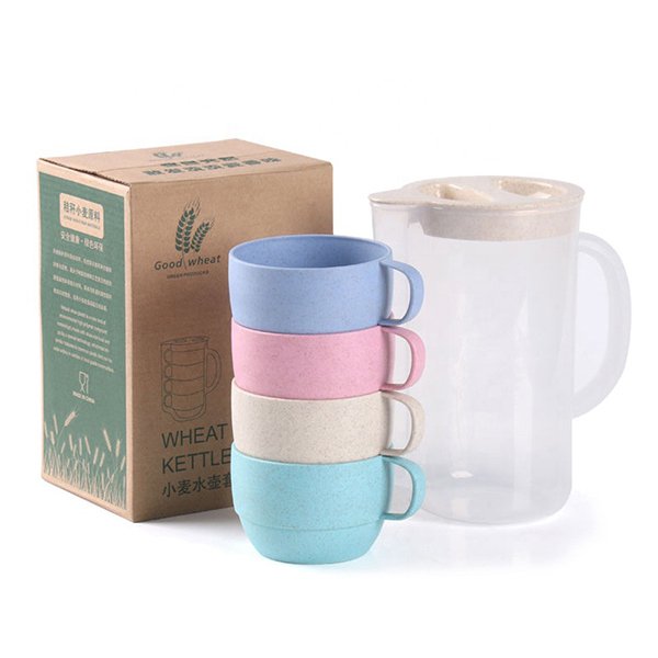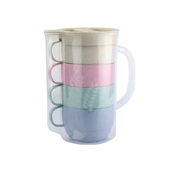 1. 小麥4入水杯水壺套組,採用環保小麥/PP材質製成,尺寸為水杯: 7*7*10cm,水壺: 20*14cm,符合健康環保概念。
